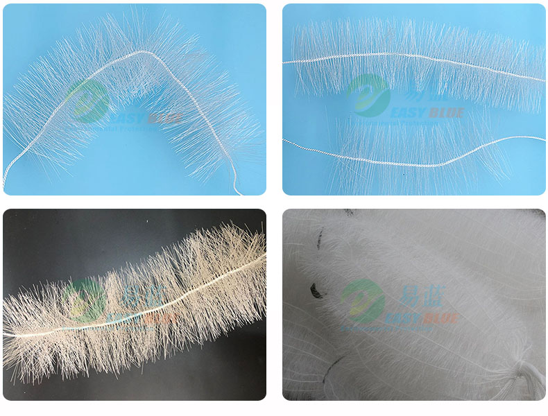 彈性立體填料篩選了聚烯烴類和聚酰胺中的幾種耐腐、耐溫、耐老化的品種,混合以親水、吸附、抗熱氧等助劑,采用特殊的拉絲,絲條制毛工藝,將絲條穿插固著在耐腐、高強度的中心繩上,由于選材和工藝配方精良,剛柔適度,使絲條呈立體均勻排列輻射狀態,制成了懸掛式立體彈性填料的單體,填料在有效區域內能立體全方位均勻舒展滿布,使氣、水、生物膜得到充分混滲接觸交換,生物膜不僅能均勻的著床在每一根絲條上,保持良好的活性和空隙可變性,而且能在運行過程中獲得愈來愈大的比表面積,又能進行良好的新陳代謝,這一特征與現象是國內目前其他填料不可比擬的。