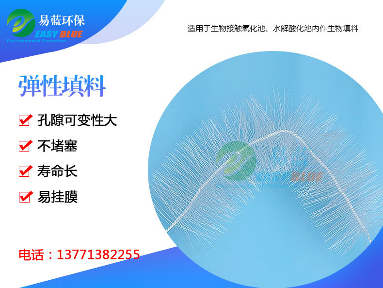 立體彈性填料與硬性類蜂窩填料相比,孔隙可變性大,不堵塞;與軟性類填料相比,材質壽命長,不粘連結團;與半軟性填料相比,比表面積大、掛膜迅速、造價低廉。因此,該填料可確認是繼各種硬性類填料、軟性類填料和半軟性填料后的第四代高效節能新穎填料。