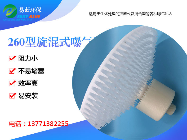 旋混式曝氣器采用多層螺旋切割的型式進行充氧曝氣,旋混式曝氣器當氣流進入260型混流型曝氣器時,氣流首先通過二道螺旋切割系統,切割后進入下層的的多層鋸齒型布氣頭,進行多層切割,使氣泡切割成微氣泡,這樣大大提高了氧的利用率,具有布氣均勻,充氧效率高的特點。