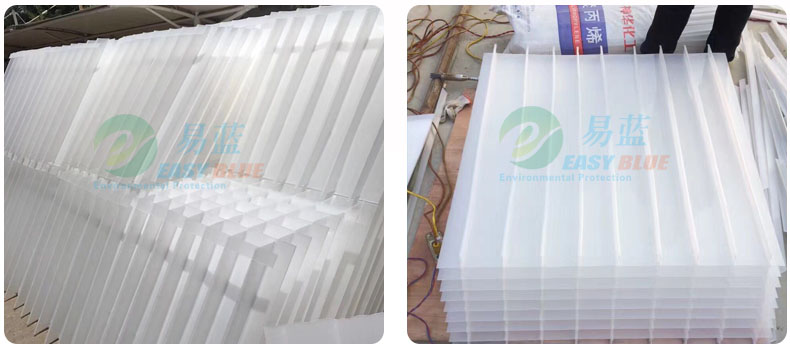 我廠生產(chǎn)的斜板,板材厚度為1mm,間距為15mm、20mm、25mm、30mm、35mm五種規(guī)格。該斜板的優(yōu)點是出水效果好,滑泥效果好,強度好,不易堵,不易倒塌。是比較理想的方形沉淀池材料。